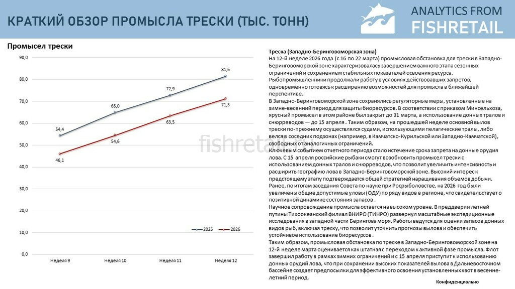 Таким образом, 12-я неделя марта зафиксировала момент, когда глобальные премиальные рынки продолжают ралли, а российский промысел — главный источник предложения на внутреннем рынке — подает первые устойчивые сигналы замедления. Если отставание по минтаю сохранится, доступность "народной рыбы" может оказаться под вопросом даже в условиях начавшей работу биржевой системы. Геополитика, издержки и экология окончательно стали главными действующими лицами, а традиционная логика "рекордный вылов — доступная цена" ушла в прошлое.