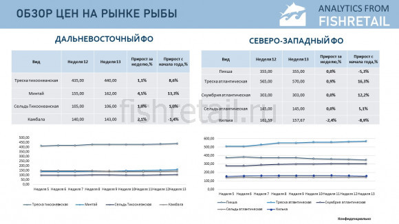 Розница тем временем продолжает планомерное движение вверх. За неделю с 17 по 23 марта прирост составил 0,22%, а с начала года цены на мороженую неразделанную рыбу уже поднялись на 3,45%. Потребитель фиксирует: рыба дорожает системно, без рывков, но неумолимо.
