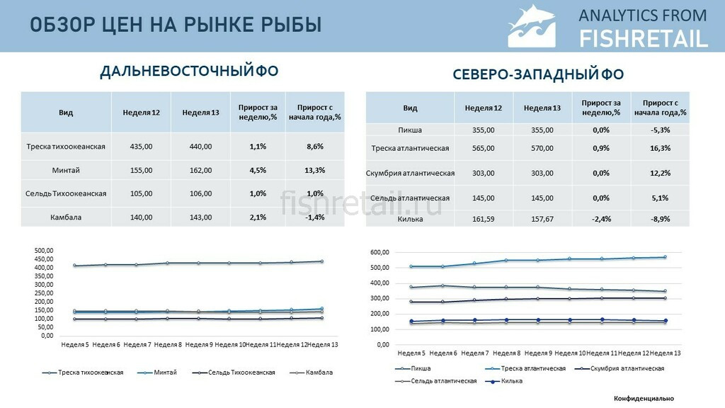 Российский рыбный рынок вступает в весну с двумя разнонаправленными, но одинаково устойчивыми трендами. С одной стороны, оптовые цены уверенно идут вверх, подгоняемые активным экспортным спросом со стороны Китая и колебаниями курса доллара. Треска, минтай, сельдь и камбала на Дальнем Востоке дорожают, и этот импульс добирается до центральных регионов, где минтай уже начал подтягиваться к дальневосточным котировкам. На Северо-Западе картина чуть сложнее: треска продолжает расти на фоне дефицита предложения, а пикша, напротив, дешевеет — дают о себе знать накопленные складские запасы. Логистика держится в привычном коридоре 25–27 руб./кг, не добавляя остроты, но и не смягчая ценового фона.