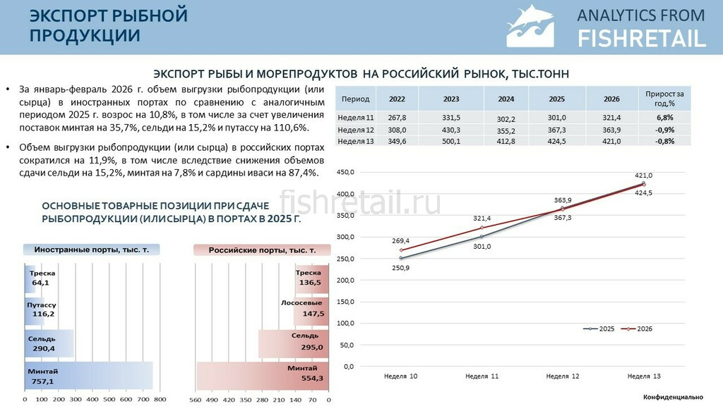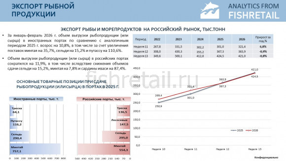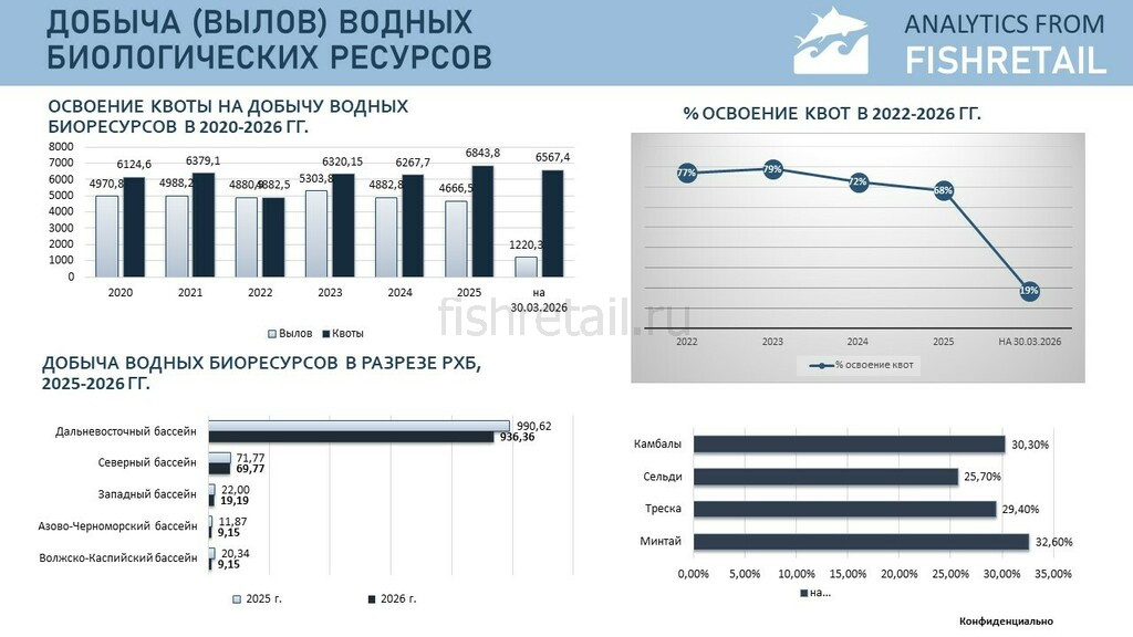 И на этом фоне российская добыча подаёт всё более тревожные сигналы. На 29 марта вылов с начала года составил 1 128,9 тыс. тонн — на 7,5% (91,4 тыс. тонн) меньше, чем год назад. Отставание усилилось по сравнению с предыдущей неделей. Дальневосточный бассейн, формирующий 90% общероссийского вылова, снизился на 5%, причём минтай проседает на 70 тыс. тонн. Лишь сельдь и камбала остаются в уверенном плюсе. Северный бассейн ушёл в минус на 3%, треска снижается, пикша растёт, но полноценно компенсировать потери не может.