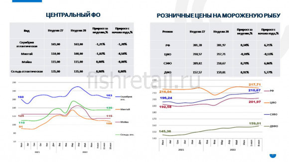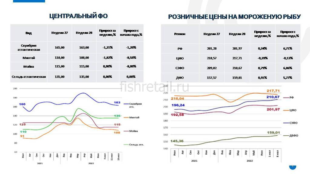 • На российском рынке динамика цен на мороженую рыбу в оптовом сегменте внутреннего рынка сохраняла тенденцию к снижению. Розничные цены снижаются. По сравнению с началом года цены остаются выше почти на 7%. Больше всего за неделю подорожала мороженая рыба в ДФО.