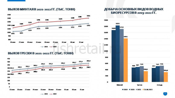 · С начала года российские рыбаки выловили на 113,45 тыс. тонн водных биоресурсов меньше, чем в прошлом году; освоение квоты составило 51%; растет добыча в Северном рыбохозяйственном бассейне, на Дальнем Востоке сокращаются показатели по лососевой путине.