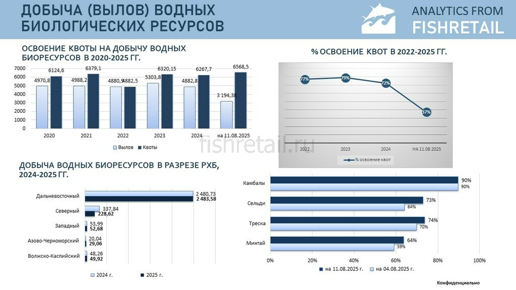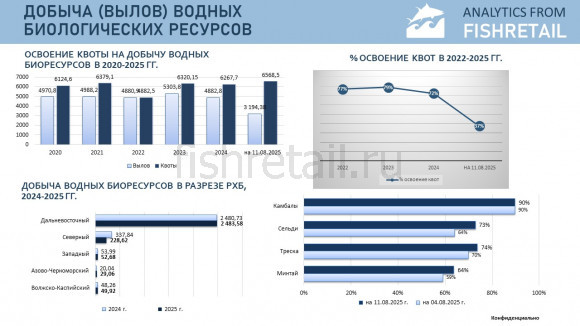 Согласно данным отраслевой системы мониторинга общий объем добычи (вылова) водных биоресурсов всеми российскими пользователями по состоянию на 11 августа 2025 г. составил 3194,4 тыс. тонн, что на 63,3 тыс. тонн меньше уровня предыдущего года (или на 1,9% меньше уровня 2024 года. В исключительных экономических зонах иностранных государств, конвенционных районах и открытой части Мирового океана объем добычи (вылова) составил 334,583 тыс. тонн (на 31,267 тыс. тонн или на 10,3% выше уровня соответствующего периода 2024 г.).