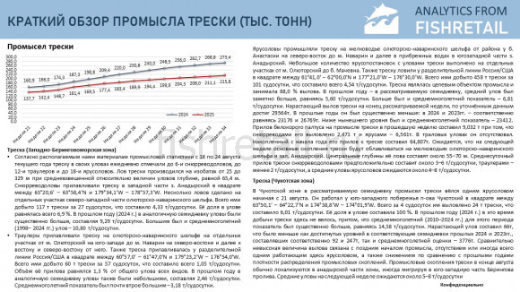 За январь - июль 2025 г. объем выгрузки рыбопродукции (или сырца) в иностранных портах по сравнению с аналогичным периодом 2024 г. сократился на 1,3%, в том числе за счет снижения поставок сардины иваси на 53,7% и трески на 26,9%.