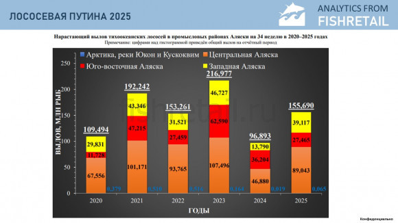 Согласно данным отраслевой системы мониторинга общий объем добычи (вылова) водных биоресурсов всеми российскими пользователями по состоянию на 17 августа 2025 г. 3285,5 тыс. тонн, что на 75,8 тыс. тонн меньше уровня предыдущего года (или на 2,3% меньше уровня 2024 года, здесь и далее – за аналогичный период с начала года). В исключительных экономических зонах иностранных государств, конвенционных районах и открытой части Мирового океана объем добычи (вылова) составил 348,569 тыс. тонн (на 31,856 тыс. тонн или на 10,1 % выше уровня соответствующего периода 2024 г.).