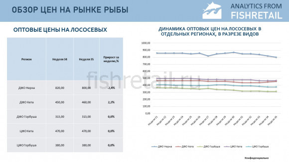 За прошедшую неделю с 25 по 31 августа т.г. цены на мороженую рыбу в оптовом сегменте внутреннего рынка сохраняли разнонаправленную динамику. На Дальнем Востоке наблюдается неустойчивая динамика цен на лососевые, цены на камбалу и минтая корректируются вверх. На Северо-западе отмечается снижение цен на сельдь атлантическую. В центральных регионах продолжилось укрепление цен на минтая.