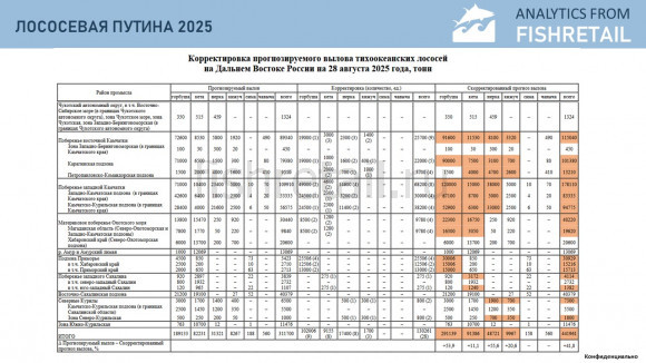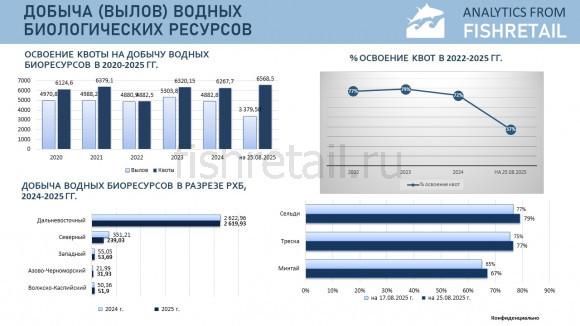 Согласно данным отраслевой системы мониторинга общий объем добычи (вылова) водных биоресурсов всеми российскими пользователями по состоянию на 25 августа 2025 г. составил 3379,5 тыс. тонн, что на 75,4 тыс. тонн меньше уровня предыдущего года (или на 2,2% меньше уровня 2024 года). В исключительных экономических зонах иностранных государств, конвенционных районах и открытой части Мирового океана объем добычи (вылова) составил 362,863 тыс. тонн (на 29,737 тыс. тонн или на 8,9 % выше уровня соответствующего периода 2024 г.).