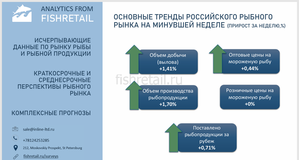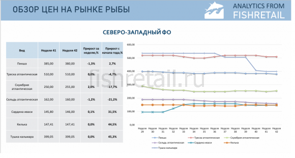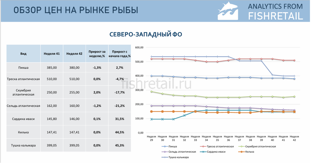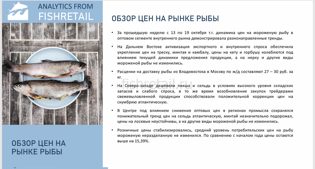 На 42-й неделе наблюдается перелом на оптовом рынке. Наиболее важное изменение недели – укрепление цен на Дальнем Востоке на ключевые виды (минтай, треска, камбала). Это говорит о том, что период избыточного предложения и слабого спроса подходит к концу. Активизация экспорта является главным драйвером этого роста.