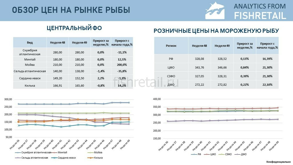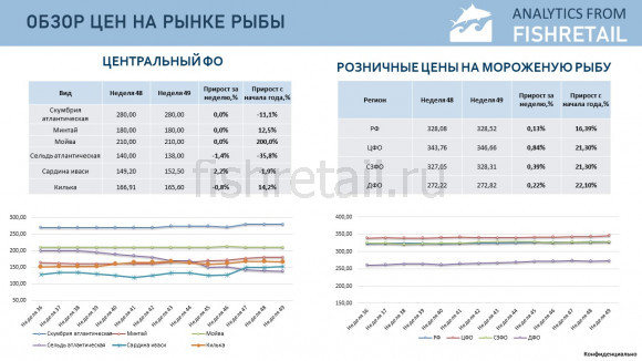 Сезонный фактор остаётся главным драйвером. Рост цен сосредоточен на праздничном ассортименте: лососевые в ЦФО и на ДВ, минтай. Это подтверждает, что потребительский спрос диктует динамику. Уникальная ситуация сложилась с треской. На одном рынке наблюдается рост цен на дальневосточную треску (из-за экспорта) и снижение цен на атлантическую (северную) треску (из-за курса рубля). Это наглядный пример, как разные факторы влияют на один вид из разных бассейнов.