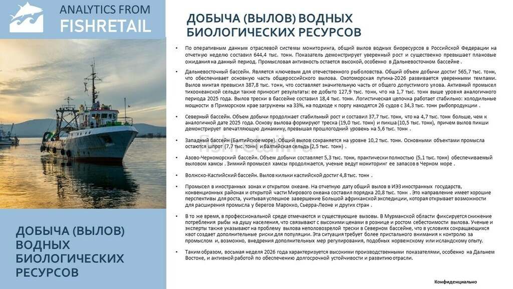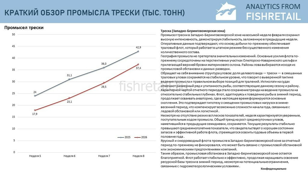 Восьмая неделя февраля стала предвестником новой эры в российской рыбной торговле. Высокий вылов создал ресурсную базу для перемен. Теперь слово за регулятором. Главный вопрос 2026 года: сможет ли административный ресурс (ФАС, биржа) победить объективные экономические факторы (издержки) и сделать рыбу доступнее для населения, или же поляризация спроса станет permanentной характеристикой рынка, где для бедных — минтай, а для богатых — семга и креветки. Ответ мы увидим уже в ближайшие месяцы.