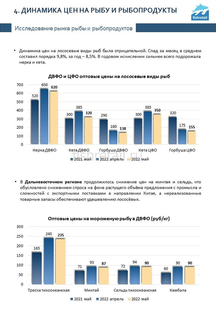 Fishretail.ru представляет ежемесячный аналитический отчет о состоянии рыбной отрасли в России по итогам мая 2022 года. Получайте самую свежую информацию о ситуации на рынках в течение нескольких минут после покупки.