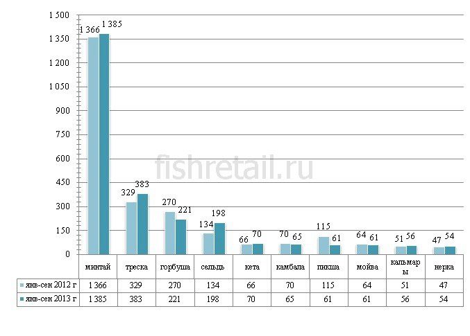 За первые 9 месяцев настоящего года в ИЭЗ РФ добыли 1 млн. 385 тыс. тонн минтая, что составило 49% от общего объема вылова. Годовой прирост объема освоения данного вида рыбы равен 1%. В общем объеме добычи рыбы и морепродуктов доля трески составляет 13%. По итогам января-сентября 2013 года выловили 383 тыс. тонн трески, это на 16% больше, чем за аналогичный период прошлого года. Такой значительный прирост показателя обеспечило увеличение объемов добычи этой рыбы в Баренцевом и Белом морях, где с начала текущего года освоили 318 тыс. тонн трески против 263 тыс. тонн, отмеченных годом ранее. За год объем вылова горбуши сократился на 18% – с отметки 270 тыс. тонн в 2012 году до уровня 221 тыс. тонн в 2013 году. Здесь важную роль сыграло уменьшение добычи горбуши в Охотском море. За первые 9 месяцев настоящего года объем освоения данного вида рыбы составил 156 тыс. тонн, тогда как за аналогичный период предыдущего года был зафиксирован уровень в 210 тыс. тонн. Тем не менее, на долю горбуши приходится 8% от общего объема добычи водных биоресурсов в ИЭЗ РФ. С небольшим отставанием по данному показателю за горбушей следует сельдь. В общем объеме освоения рыбы и морепродуктов 7% приходится на вылов данного вида рыбы. В январе-сентябре 2013 года добыча достигла 198 тыс. тонн сельди, превысив тем самым аналогичный показатель 2012 года на 48%. Положительная динамика объема вылова наблюдается и в отношении следующих видов биоресурсов, вошедших в десятку крупнейших по данному показателю: с начала текущего года кеты освоили на 6% больше, чем годом ранее, объем добычи составил 70 тыс. тонн, кальмаров – на 10% (56 тыс. тонн), нерки – на 16% (54 тыс. тонн). Относительно мойвы и камбалы зафиксировано сокращение объема вылова на уровне 5% и 8% соответственно. Наибольший спад показателя отмечен на пикшу, за первые 9 месяцев 2013 года освоили 61 тыс. тонн этого вида рыбы, что на 47% меньше, чем за аналогичный период 2012 года.