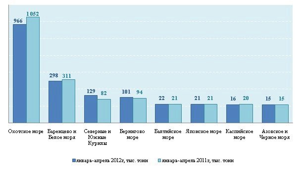 В Охотском море за год вылов сократился на 8% из-за низких объемов добычи минтая и сельди - на 7% (до 794 тыс. тонн) и 23% (до 103,6 тыс. тонн) меньше уровня прошлого года соответственно. Доля этих биоресурсов составляет 93% от общего объема вылова в данной аквазоне. Вылов также продемонстрировал отрицательную динамику в Баренцевом и Белом морях, а также в Каспийском море.