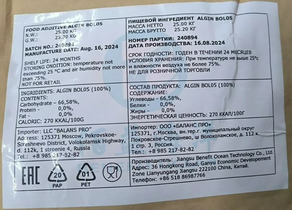 Альгинат натрия Benefit Ocean / Nanshan (E401) Пищевой загуститель, 1000