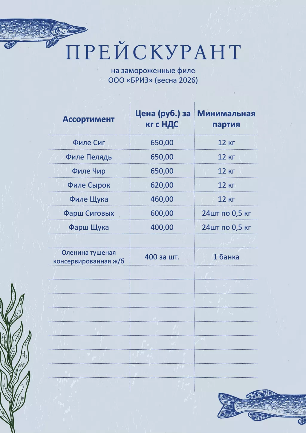 ООО "Бриз" - основанная в 2013 году омская компания оптово-розничной торговли свежемороженой рыбы. Вся наша рыба вылавливается в Ямало-Ненецком автономном округе. Она проходит строгий контроль качества и имеет все надлежащие ветеринарные документы. Будем рады сотрудничеству с вами!