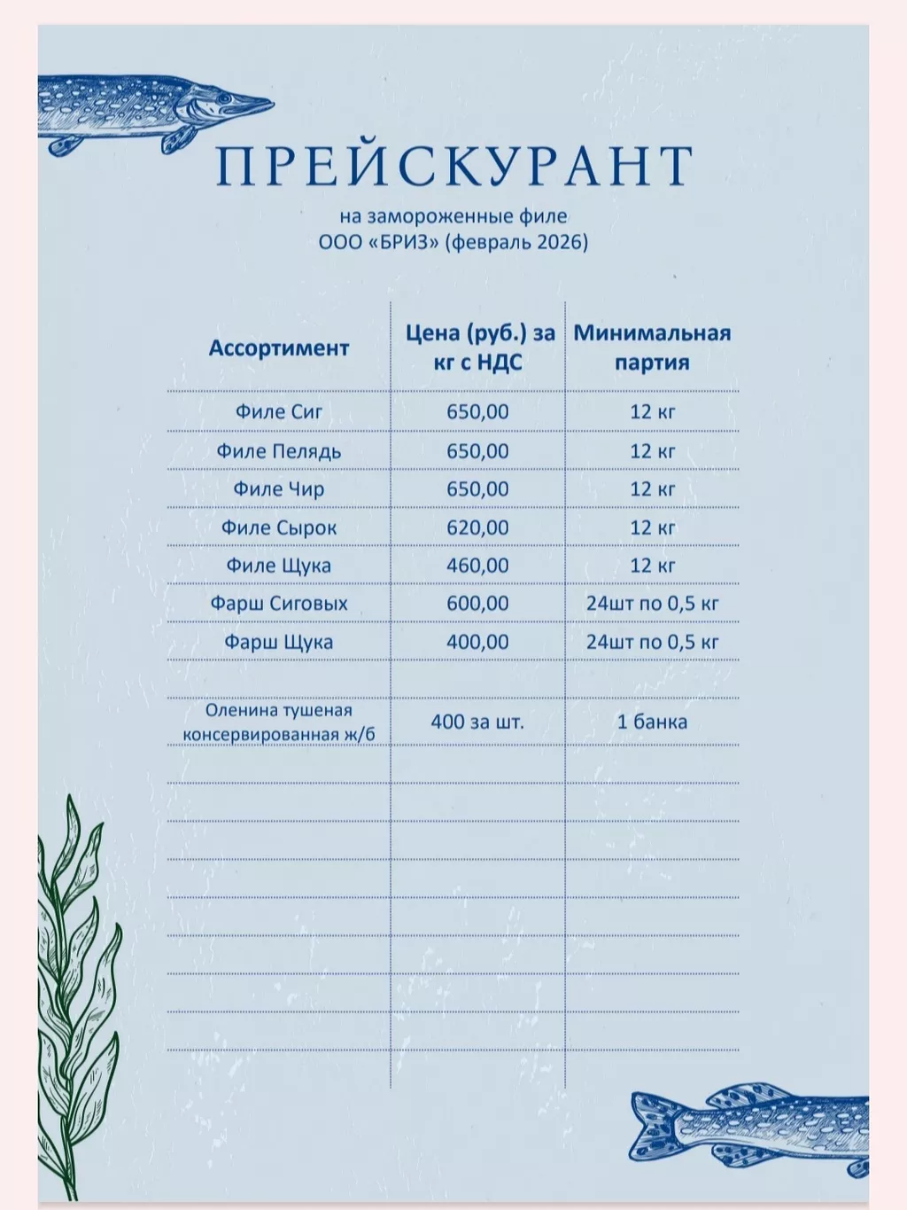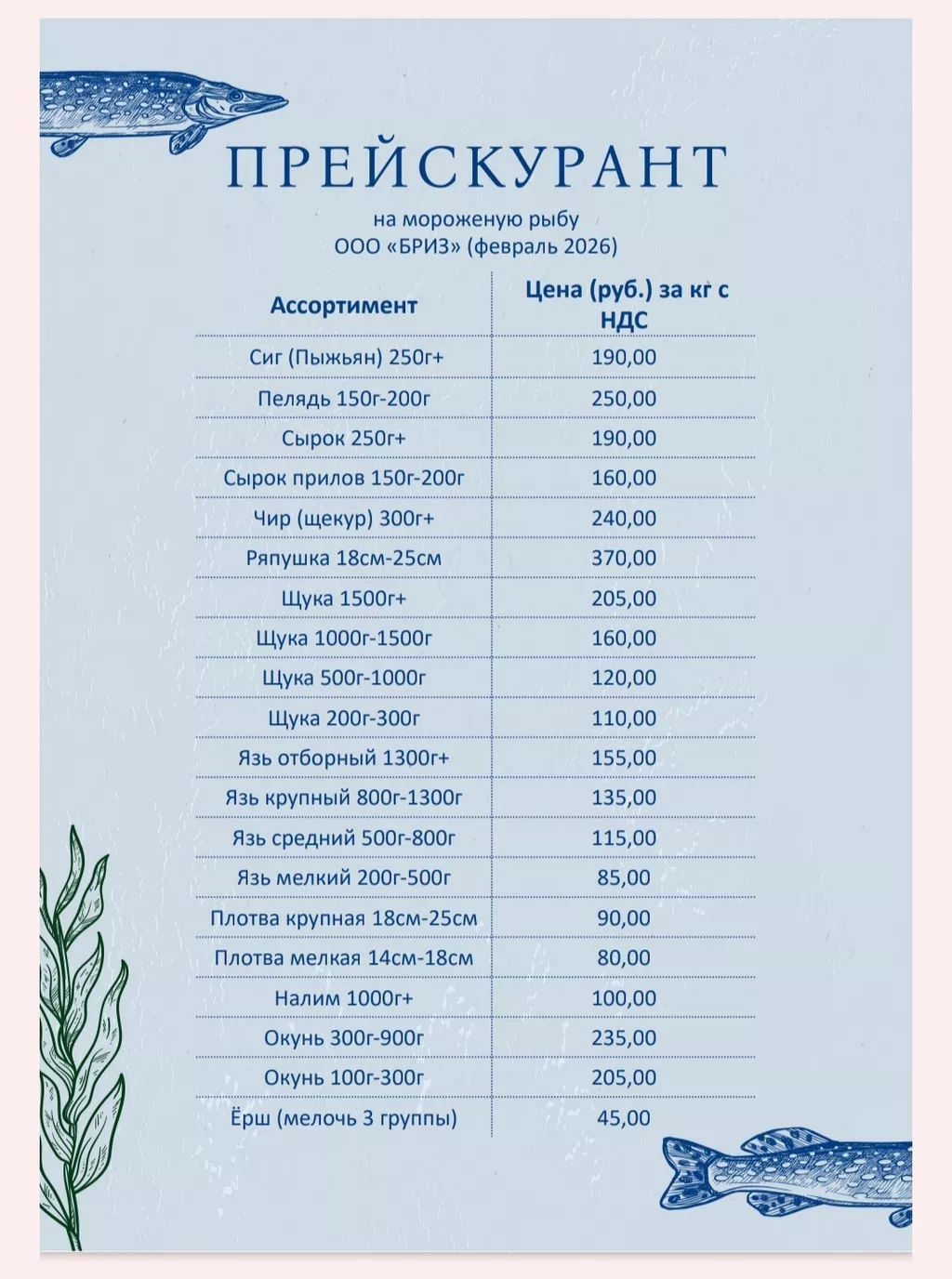 ООО "Бриз" - основанная в 2013 году омская компания оптово-розничной торговли свежемороженой рыбы. Вся наша рыба вылавливается в Ямало-Ненецком автономном округе. Она проходит строгий контроль качества и имеет все надлежащие ветеринарные документы. Будем рады сотрудничеству с вами!