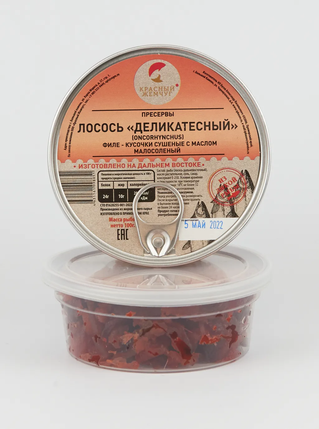 Пресерва Лосось “Деликатесный” филе-кусочки сушеные в масле (100г) /ИП Бусов А.В. (Приморский край), СТМ Красный Жемчуг