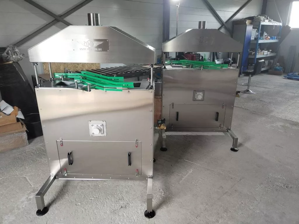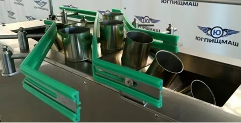 Посредством подающего пластинчатого транспортера* жестяная банка попадает на барабан устройства, оборудованный постоянными магнитами, удерживающими банку. Попав на барабан устройства тара проворачивается в зону ошпарки, где обрабатывается острым паром. После обработки паром тара посредством системы направляющих подается на отводящий транспортёр* и поступает на следующую технологическую операцию.